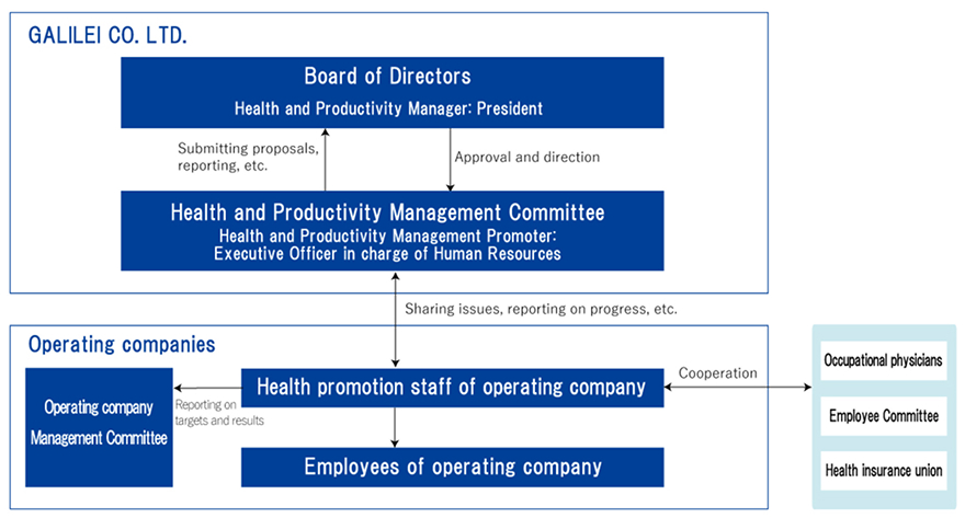 The GALILEI Group designates the President as Health and Productivity Manager, and the Executive Officer in charge of Human Resources as Health and Productivity Management Promoter and Chairperson. They work together with the Health and Productivity Management Committee (commonly known as Aoharu Team) and the Health Management Office, both of which are under the management of the Human Resources Department, to develop and implement health management measures and monitor the progress of health and productivity management measures through the Management Committee. The Aoharu Team consists of the Human Resources Department, the Corporate Planning Department, staff engaged in health-related jobs in each business site, occupational physicians, occupational health nurses and other medical staff, the Health and Safety Committees, the Employees Committee, and the Kirari Promotion Office. The Aoharu Team discusses health issues and items requiring improvement from a diverse, unbiased viewpoint and determines company-wide health management measures to take.