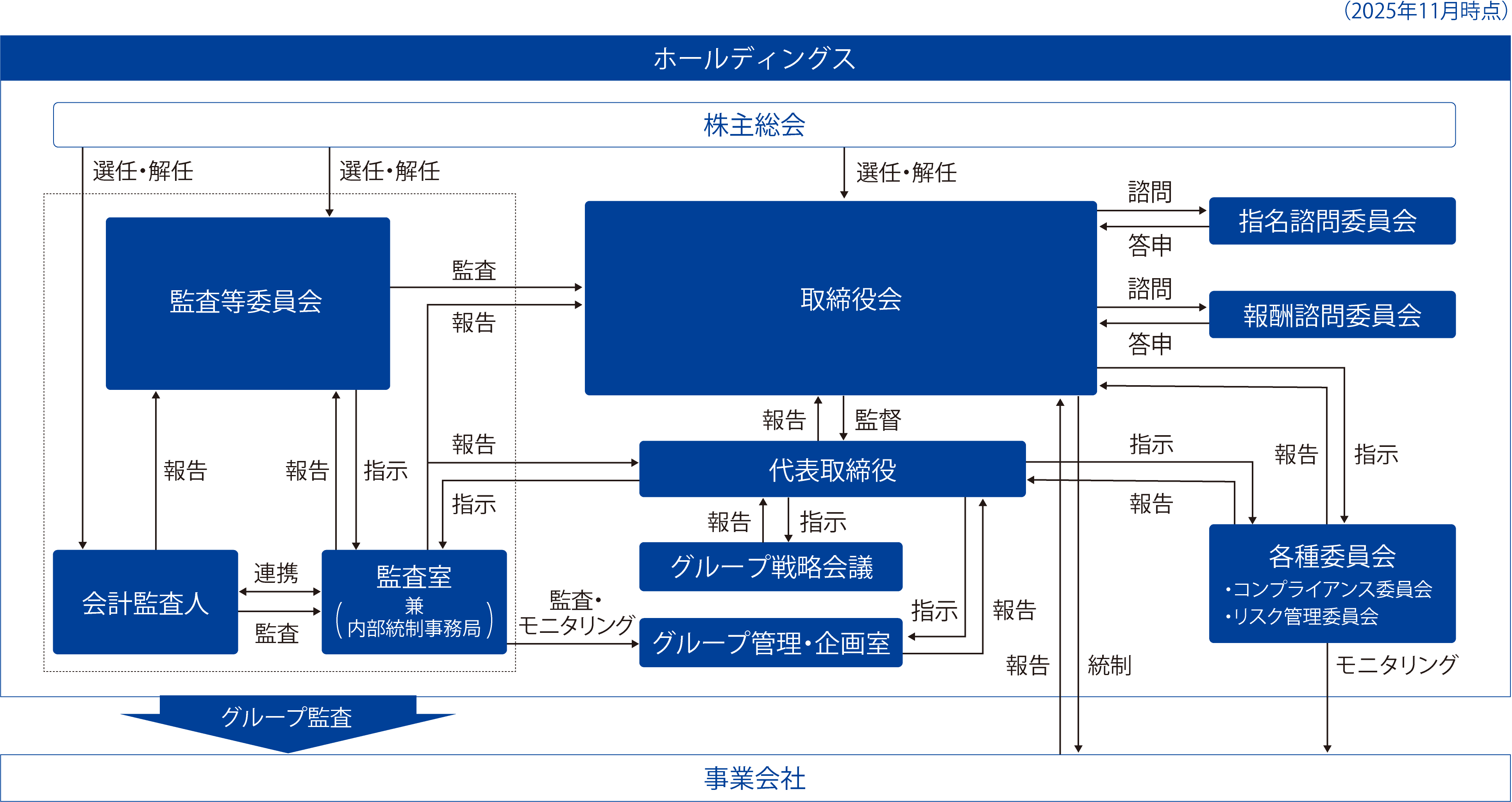 当社は、迅速かつ機動的な意思決定と経営戦略などの議論の 一層の充実と監督機能の強化を実現するため、監査等委員会設置会社を採用しています。また、役員の指名及び報酬などの 検討に当たっては、独立社外役員が過半数で構成される指名諮問委員会・報酬諮問委員会を設置しており、指名及び報酬決定 のプロセスについて客観性及び透明性を確保しています。