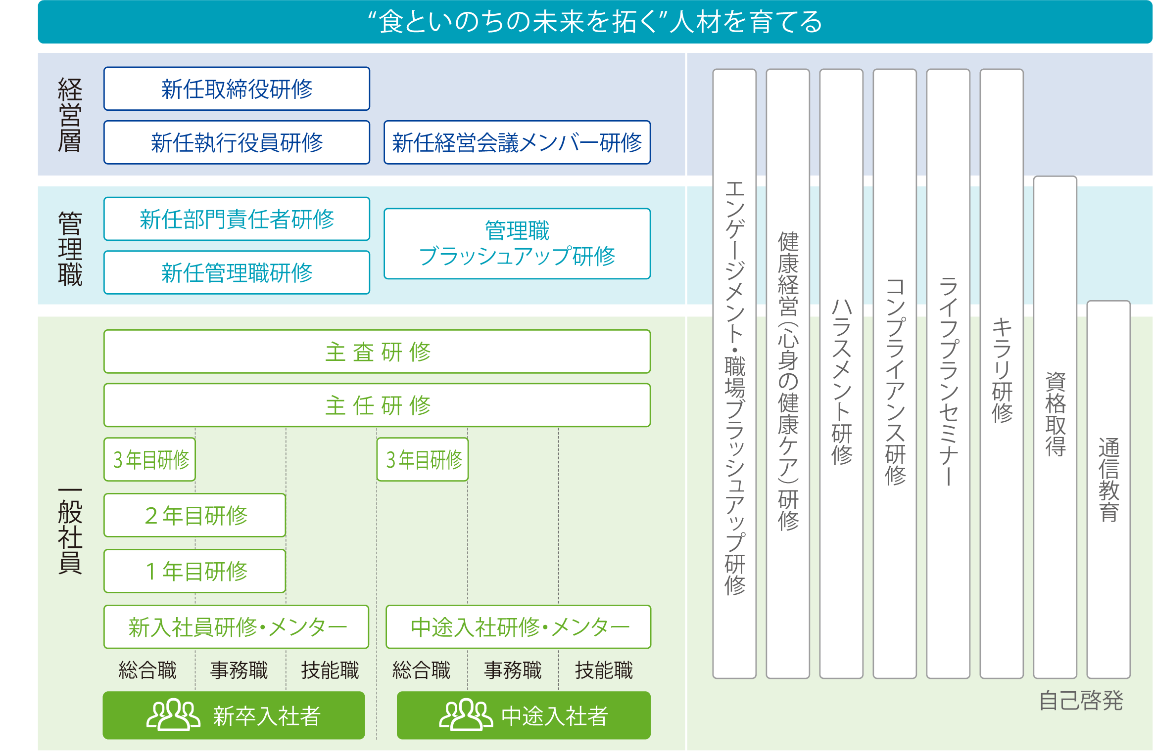 ガリレイグループは、「食といのちの未来を拓く」人材を育てるため、教育制度・教育体制の整備、従業員エンゲージメントの向上に取り組みます。